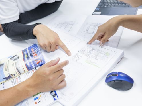 図面から工事に必要な材料の種類と数量を正確に読み取って集計します。さらに工事の工程と照らし合わせながら、いつどこにどれだけ材料を納品してもらうか確認して、材料を発注します。また、工事の工程に合わせて、衛生設備工事・空調設備工事・ガス工事など、実際に作業をしてもらう職人さんを手配します。